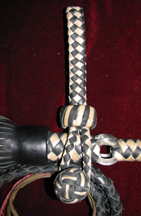 Шахматный Whip Holster. Основа - чепрак. Оплётка в 8 полос (петля в 4). Узел - турецкая голова двухцветная. Схема закрепления кнута видна на фото.