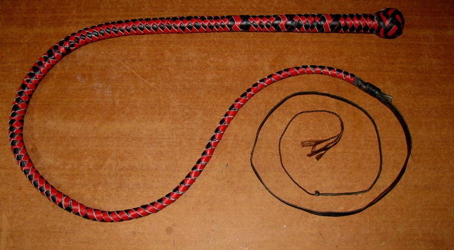 Основа кнута сыромятная. внешняя оплётка тонкой хромовой кожей двух цветов.